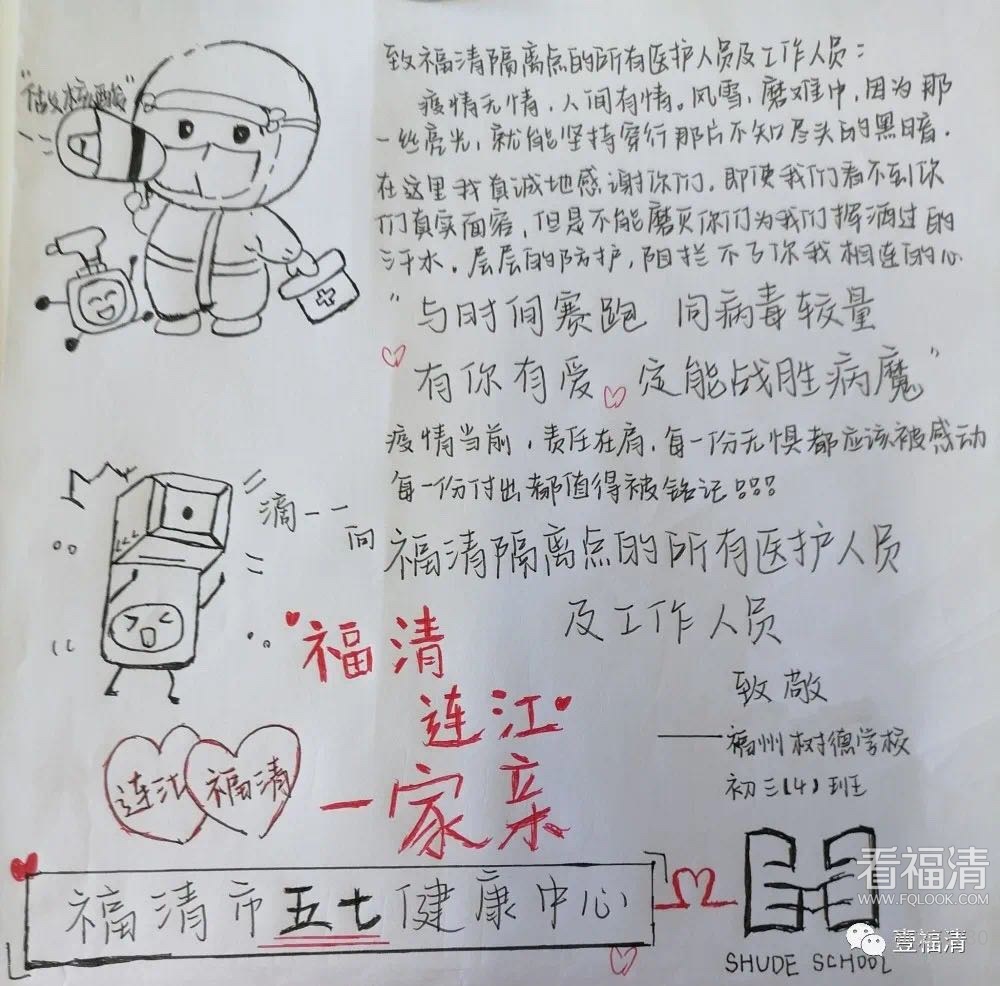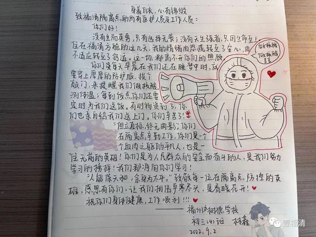 前不久,在五七健康中心结束隔离的120名连江师生,临别前留下了一封封手写的感谢信,感谢五七健康中心全体工作人员的细心周到的服务。这些珍贵的文字,被梁诗志小心翼翼地收集了起来,也以此激励自己。