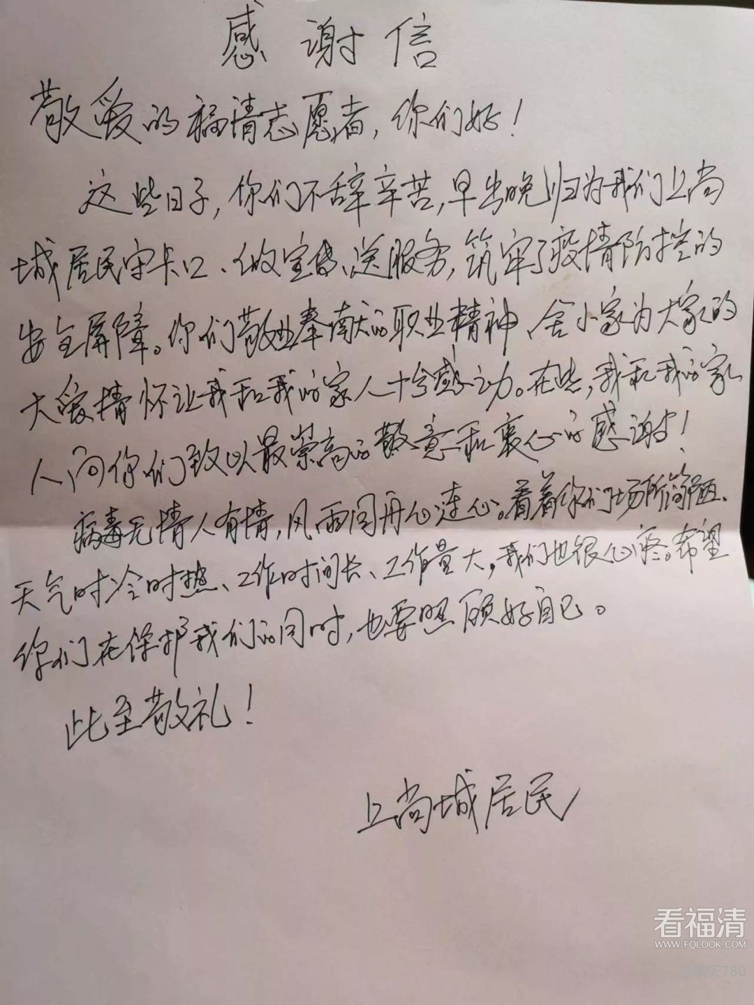 “爱” 是相互的,林俊和组员们的责任担当、主动作为感动了当地居民。辗转而来的感谢信,放下奶茶、烧饼就走的居民群众,这些善意的举动,道出浓浓抗疫情,温暖了每一位福清志愿者的心,也体现了大家众志成城抗击疫情的决心和信心。