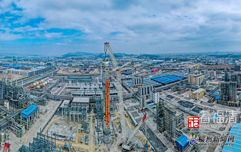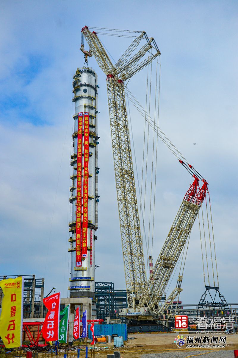 21日上午,全球高度最高容积最大丙烷丙烯分离塔在福清江阴中景石化科技园成功吊装。